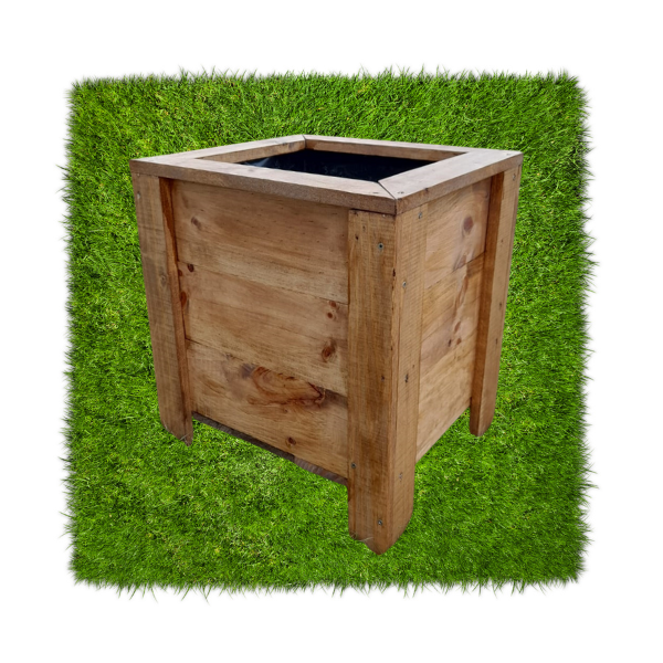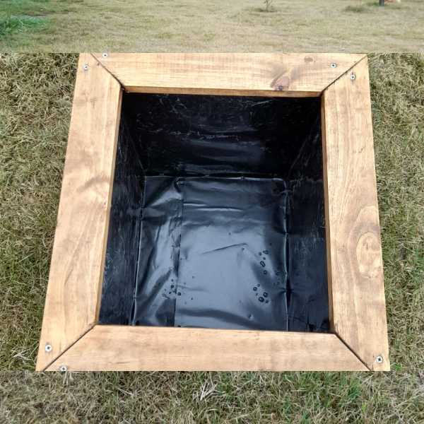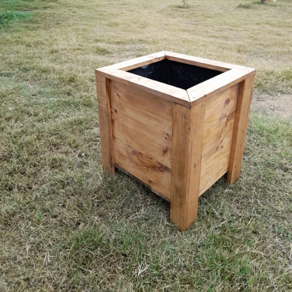 Maceta de pino cepillado 40x40x60, con protector de madera a elección (nogal, alerce, natural, roble) y nylon aislante, con agujero de drenaje.
